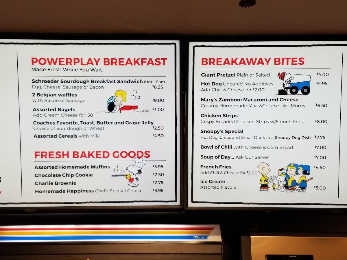 Start your day with the Powerplay Breakfast, featuring the indulgent Schroeder Sourdough Breakfast Sandwich or delightful Belgian waffles paired with crispy bacon. For a midday treat, explore the Breakaway Bites like Mary’s Zamboni Macaroni and Cheese or sip a warm bowl of chili.